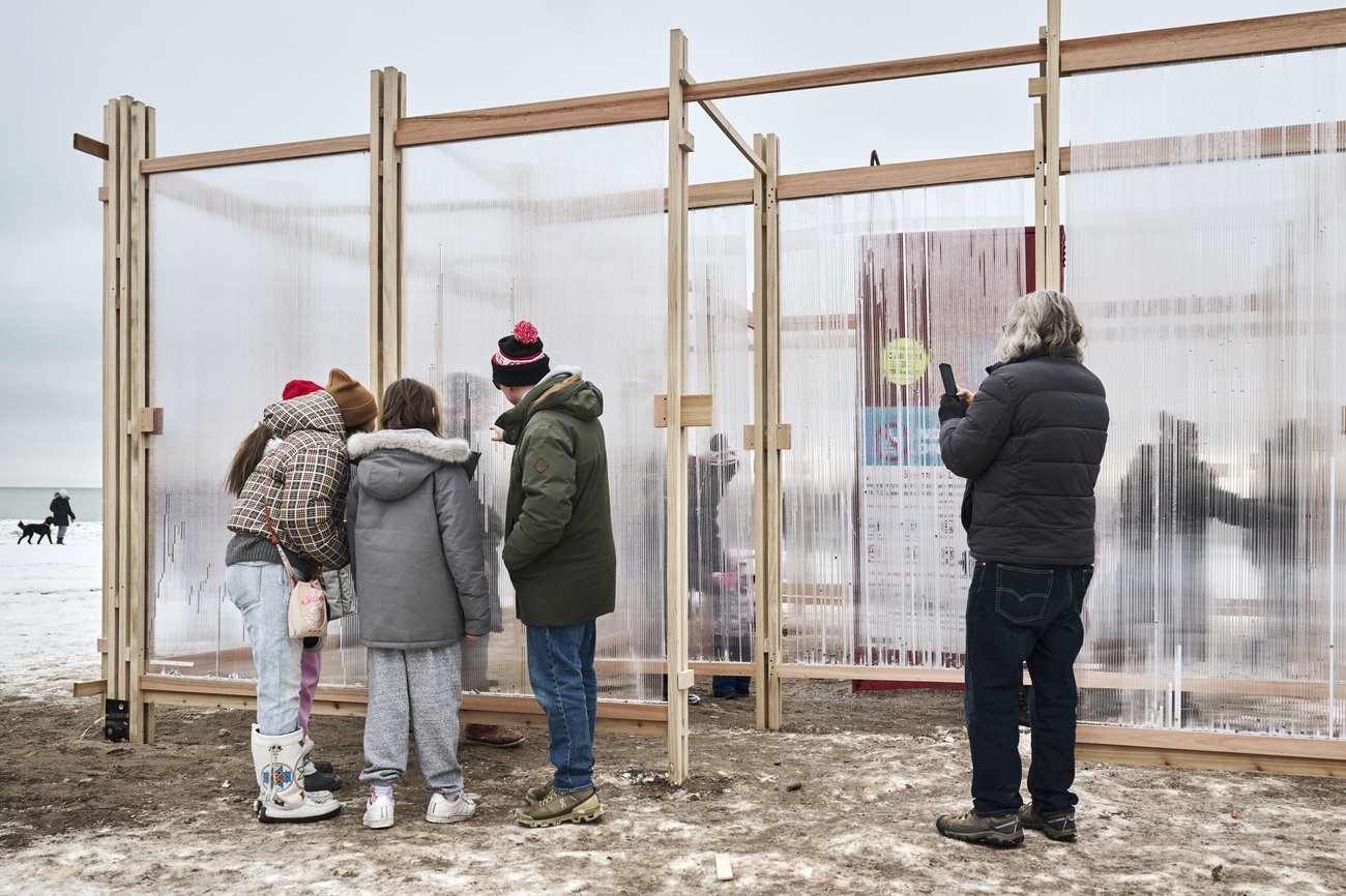 The lifeguard stand has become the fixed marker of the Winter Stations competition: an element that survives each annual installation, anchoring every design to Woodbine Beach. A series of vertical polycarbonate panels, filled with water from the lake nearby, creates a set of ice lenses that glaciate the stand. As the lake water freezes and thaws, the panels cycle through phases of transparency, translucency, and full opacity. The stand is never wholly visible or wholly concealed; instead, it appears through fragments, outlines, and momentary flashes of red. This collage of visual clarity creates a celebratory mirage of the lifeguard externally, and a mirage of Woodbine Beach from within.