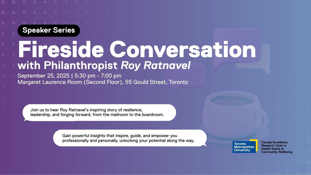 Join us for a free, in-person event, Fireside Conversation with Philanthropist Roy Ratnavel, hosted by the Canada Excellence Research Chair in Health Equity and Community Wellbeing. The event will take place on Thursday, September 25, 2025, from 5:30 to 7:00 PM EDT. Please join us at the Margaret Laurence Room (Second Floor), 55 Gould Street, Toronto, ON. Register here to confirm your attendance.