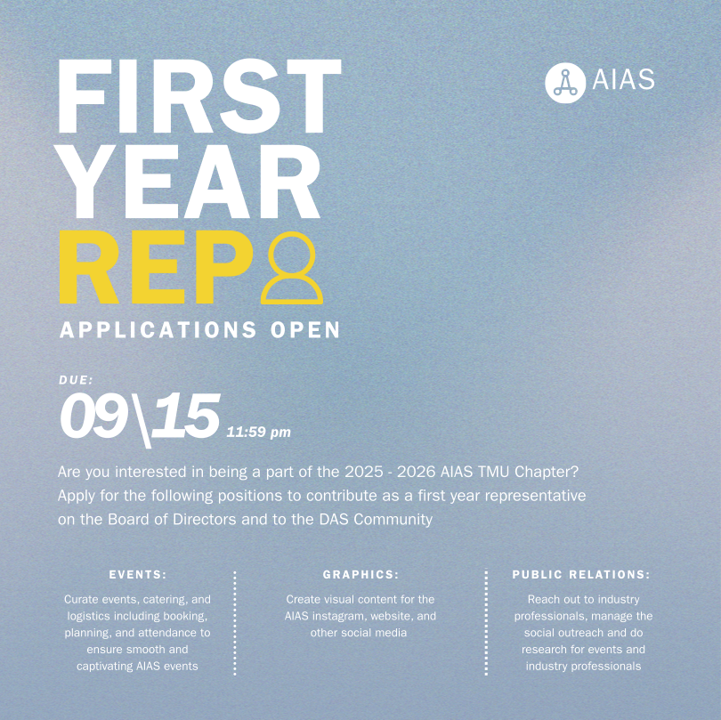 Are you passionate about design, community, and professional growth? We're looking for enthusiastic and creative first year students to join the 2025–2026 AIAS TMU Chapter! Apply now to be a part of the Events, Public Relations, or Graphics teams and help shape the experiences and opportunities AIAS provides to the DAS community.