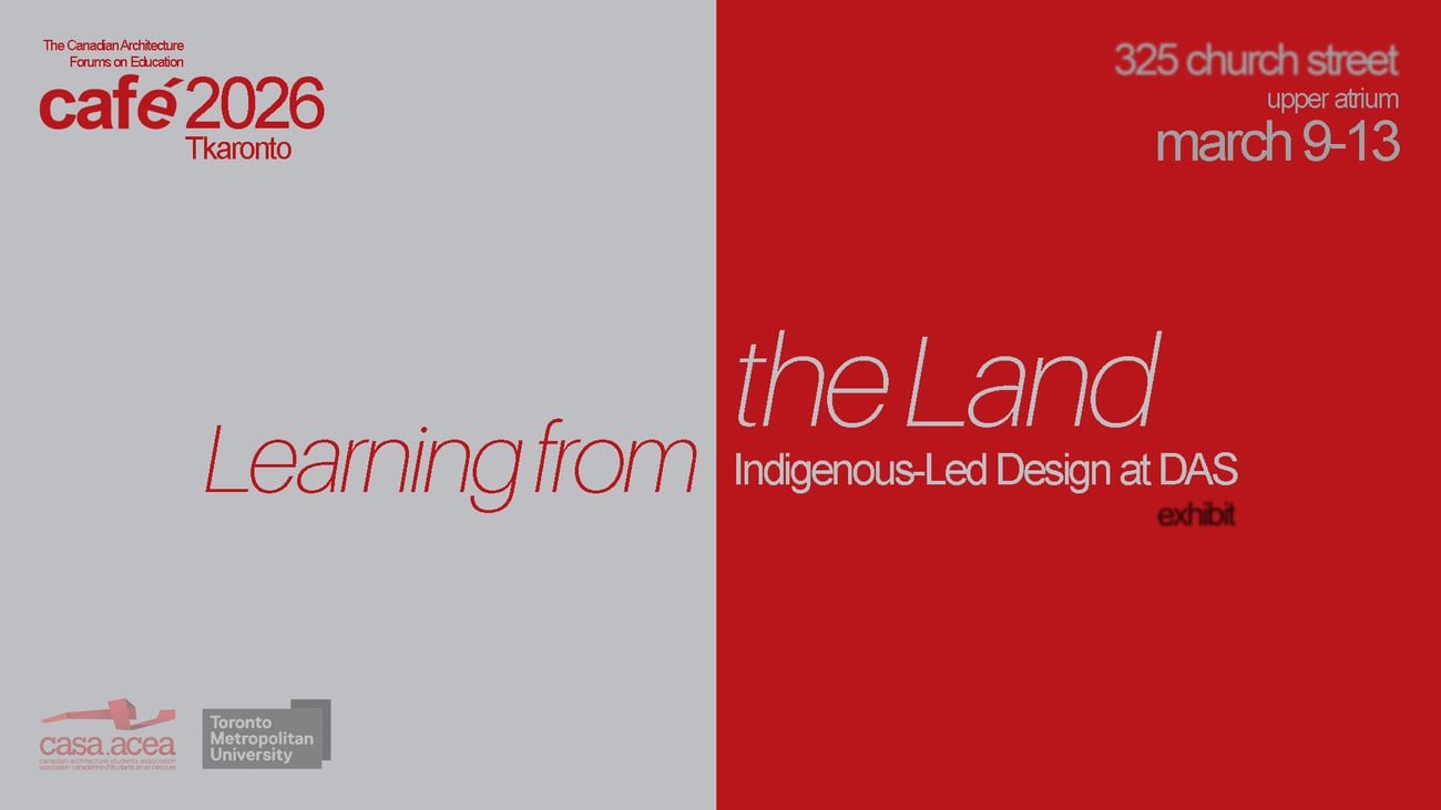 Installed in the DAS Upper Atrium, the exhibition highlights architectural inquiry grounded in land-based perspectives and community knowledge, reflecting diverse approaches to investigation and research within the Department of Architectural Science. The exhibition forms part of the Canadian Architecture Forums on Education (CAFÉ 2026) programming taking place across Canada, including a keynote panel on March 20 at the Daniels Faculty of Architecture, Landscape, and Design at the University of Toronto - details coming soon.