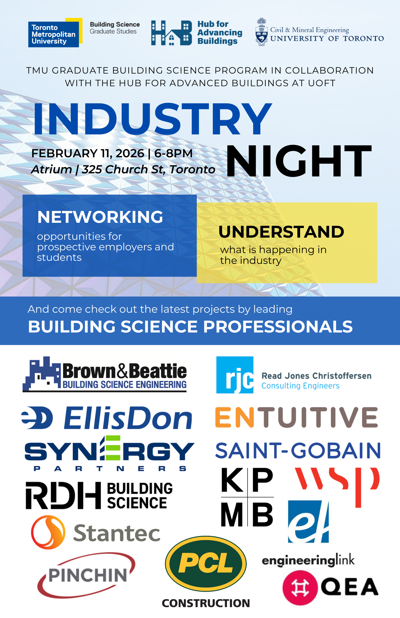 The Graduate Building Science Program at Toronto Metropolitan University would like to invite you to participate in our Industry Night this year, on February 11th, 2026 from 6:00pm - 8:00pm at 325 Church Street, Toronto!